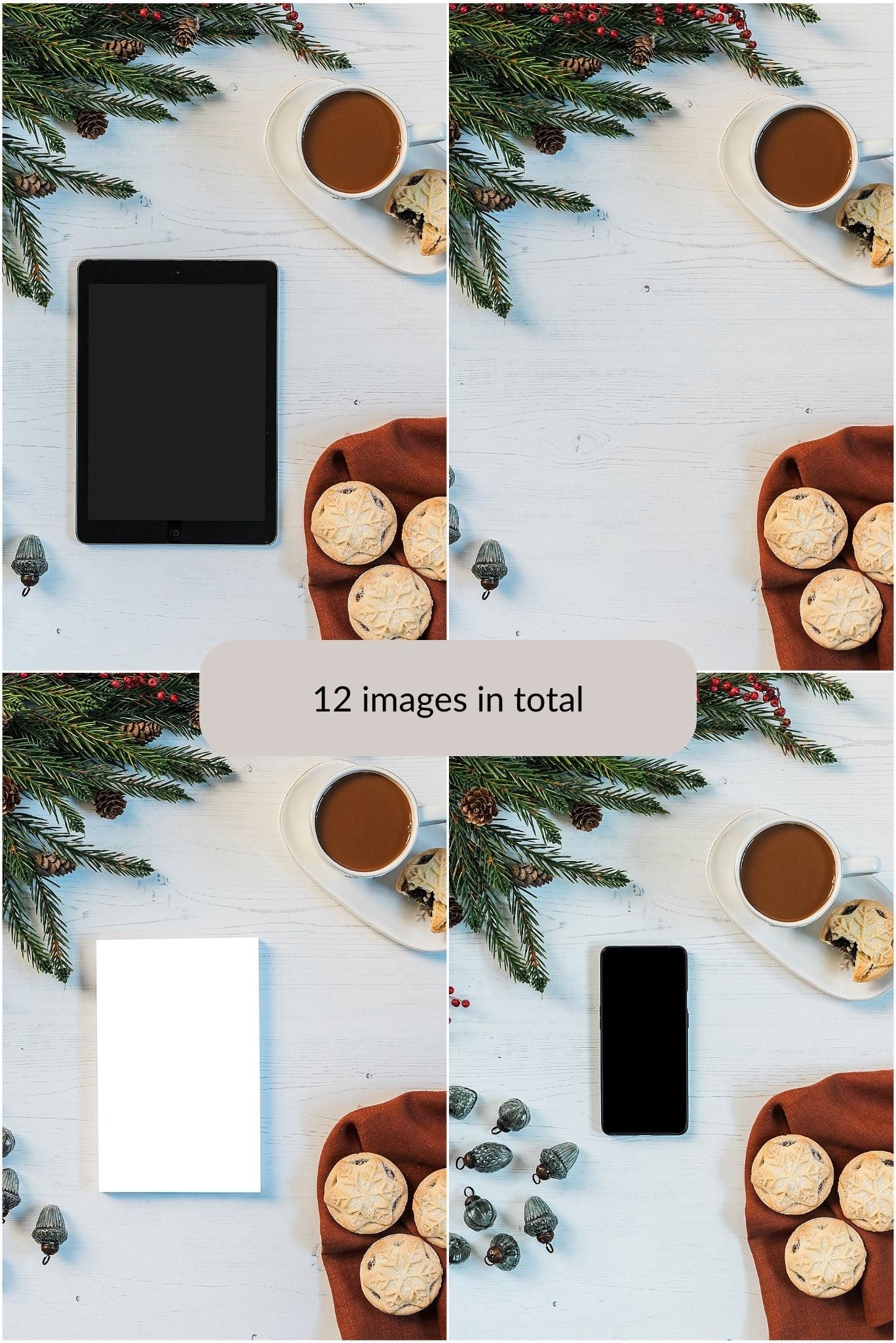 A winter inspired desk with a cosy hot chocolate, festive branches, decorations and mince pies to create this styled flat lay stock image collection comprising of phone, tablet and book mock ups along with a blank desk for adding your own product cut out (such as stationery) or your own text in the scene.